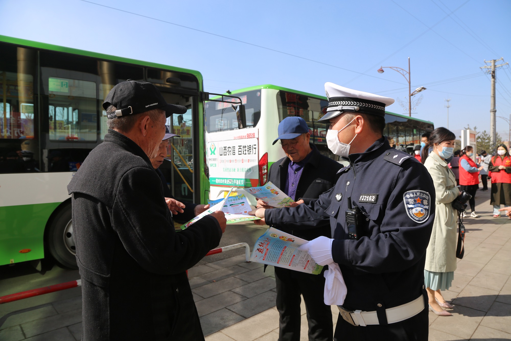 活动中,民警走上客运车,给乘客发放交通安全宣传资料,向乘客面对面宣传交通法律、法规,向群众讲解近期发生在辖区的道路交通事故典型案例,以案说法,提醒广大乘客要系好安全带、杜绝向车窗外抛物,养成良好的乘车习惯,自觉遵守交通法规,做一名合格的公民。提醒大家疫情虽得到了很好的控制,但广大乘客在出行时,还要佩戴口罩,做好自身防护,确保自身安全。同时告诫客运司乘人员要摒弃交通陋习,不乱停乱放、不开“怄气车”、不随意鸣喇叭、占道抢道、随意调头、随意停车上下揽客等行为,自觉做到文明驾驶,安全驾驶,礼貌行车。
