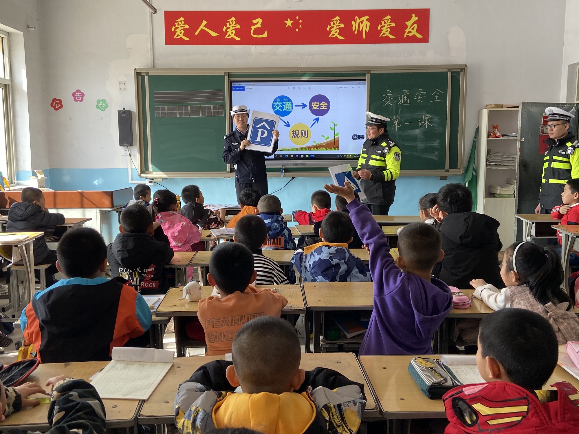 活动中,民警深入校园、课堂,从日常交通安全出行常识、日常出行如何保护自己出发,为学生们上了一堂生动的交通安全课。课上,民警结合典型交通事故案例,让学生们深刻理解并认识到乘车不系安全带、乘坐摩托车和电动自行车不佩戴安全头盔、随意横穿马路、骑自行车双手离开把手、攀爬车辆及道路隔离设施等行为的严重危害,教育和引导师生拒绝各类交通违法行为,养成良好出行习惯。最后,民警号召学生充分发挥“小手拉大手”作用,积极向爸爸妈妈、爷爷奶奶宣传交通安全知识,做一名合格的交通参与者。