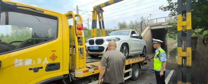 正在辖区路段执行巡逻任务的交管八大队党留庄中队负责人宋英明接到大队指令后,立即带领中队民辅警赶赴现场。到达现场后,交警发现积水已没过车辆轮胎,所幸被困驾驶人及时离开驾驶室。