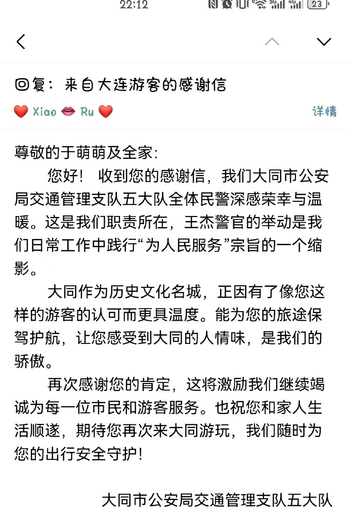 假期结束后,于女士特意将一封饱含感激之情的感谢信寄至交管五大队。信中写道:“在陌生的城市遇到困难,是大同交警的及时帮助让我们感受到了家人般的温暖,你们高效的工作效率和热情的服务态度,不仅解决了我们的实际问题,更让我们对大同这座城市留下了深刻而美好的印象,为大同交管民警点赞!”