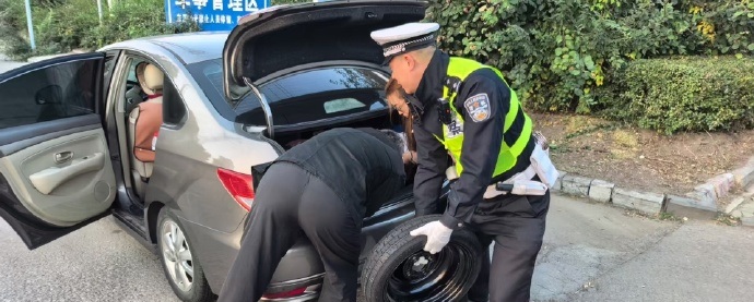 随后,民辅警从巡逻车上取出千斤顶、扳手等工具,分工协作,有的负责指挥过往车辆注意避让,有的则熟练地拆卸轮胎、安装备胎、紧固螺丝。整个过程动作迅速、操作规范,仅用十余分钟便成功为车辆更换好了备胎。看着重新恢复正常的车辆,于女士及其家人连连向民辅警道谢。