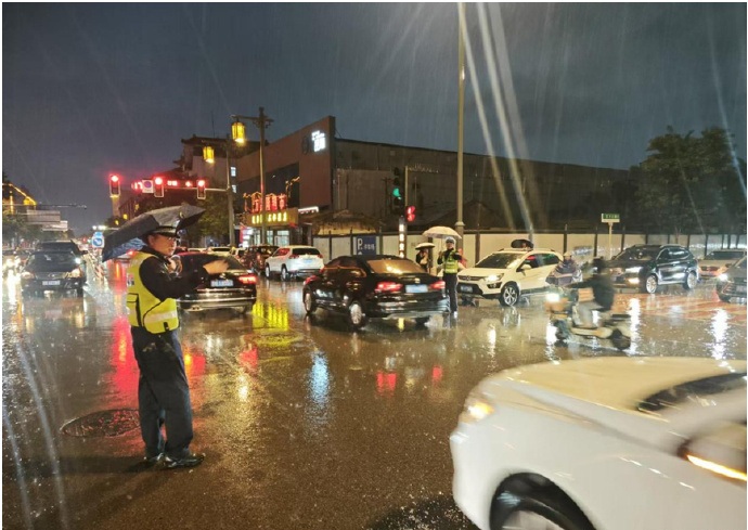 雨中的晚高峰,极易造成交通拥堵,岗勤中队、执法小分队和各护学民辅警密切配合,采取“定点值守+流动巡查”的立体化勤务模式。在永安东西大街、恒山南北路等主干街道、各校园周边等重点区域,执勤民警定点值守,通过手势指挥、喊话提醒等方式引导车流有序通行;流动巡逻警力则驾车穿梭于各路段,实时排查积水点、易滑路段等安全隐患,对发现的险情第一时间处置。在辖区重要路口,执勤民警置身于大雨之中,一边有序引导车辆分流,一边反复提醒驾驶员:“雨天路滑,请保持车距、减速慢行!”。