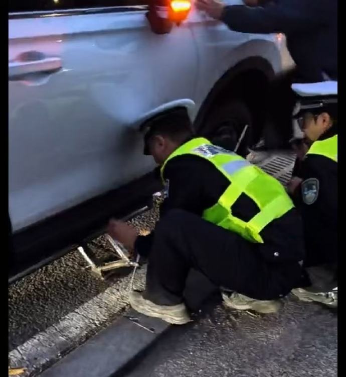 [!--empirenews.page--]经询问得知,驾驶员驾驶途中右前轮突然爆胎,由于缺乏换胎经验,随车工具也使用不熟练,正被困路边焦急万分。了解情况后,民警们迅速从工具箱中取出专业工具,俯身在车下拆卸旧胎、安放备胎、拧紧螺丝,整套动作有条不紊。十余分钟后,备胎更换完毕,车辆故障顺利排除。