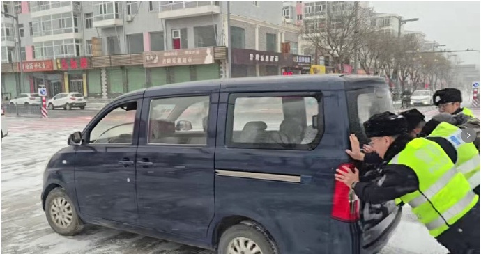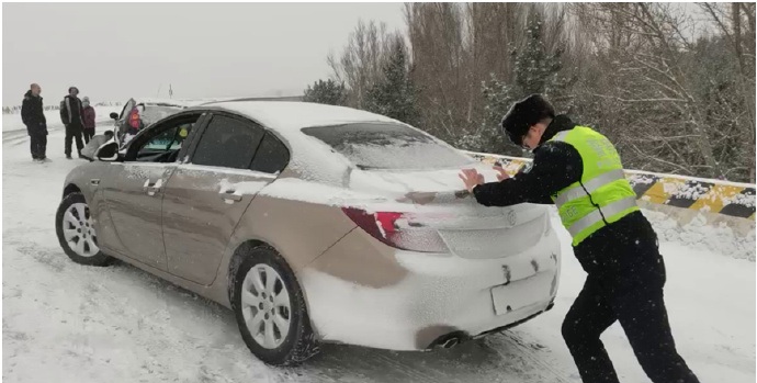 [!--empirenews.page--]在省道203线,浑源县公安局交通管理大队五中队二岭执勤组加强对二岭村至浑云交界的山区路段的巡逻管控,湿滑的路面上,车辆打转难行。辅警立即化身“推车侠”,不遗余力地助推车辆脱困。在县城同样发生了车辆故障抛锚在路上的情况,五中队岗勤执勤组迅速伸出援手,将车辆推至安全地带等待救援。