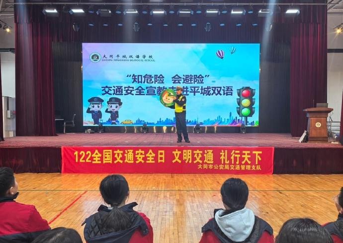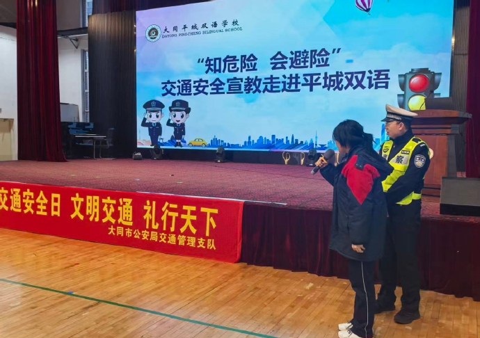 第一场雪来得轰轰烈烈,外面冰天雪地,平城双语中学校园内却暖意融融。12月12日,交管四大队的宣传民警们走进校园,以“知危险会避险”为主题,为全校师生带来了一堂生动又实用的交通安全教育课。